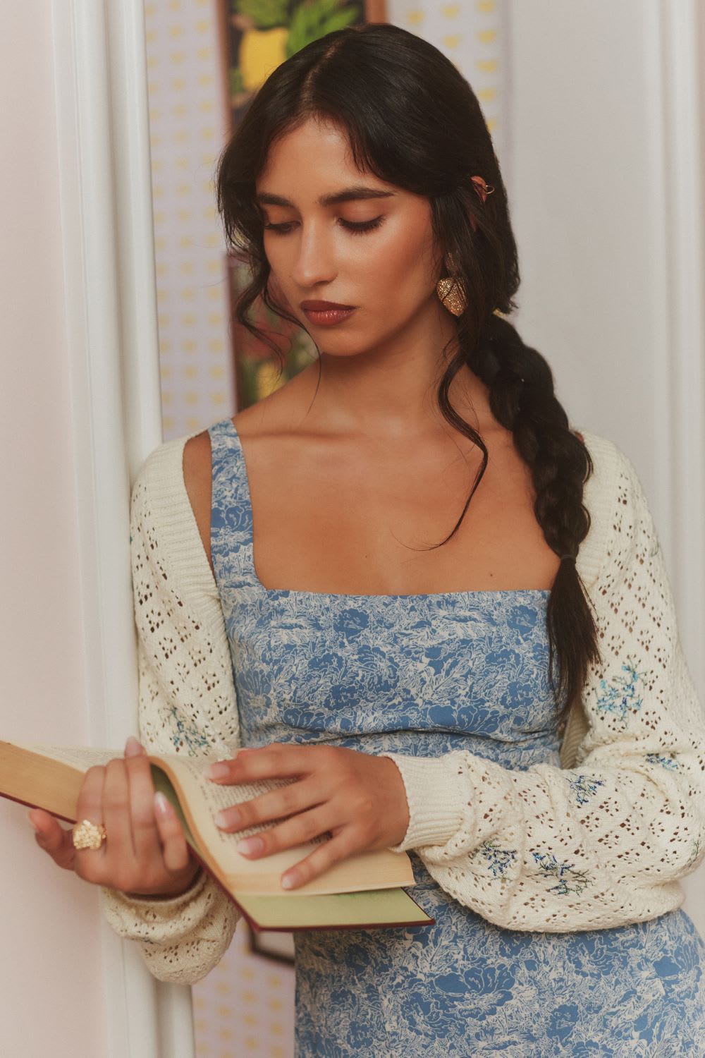 Store the Look: Lyrica Ivory Floral Pointelle Open-Entrance Shrug Sweater, Exuberant Chicness Blue Floral Sleeveless Mini Costume