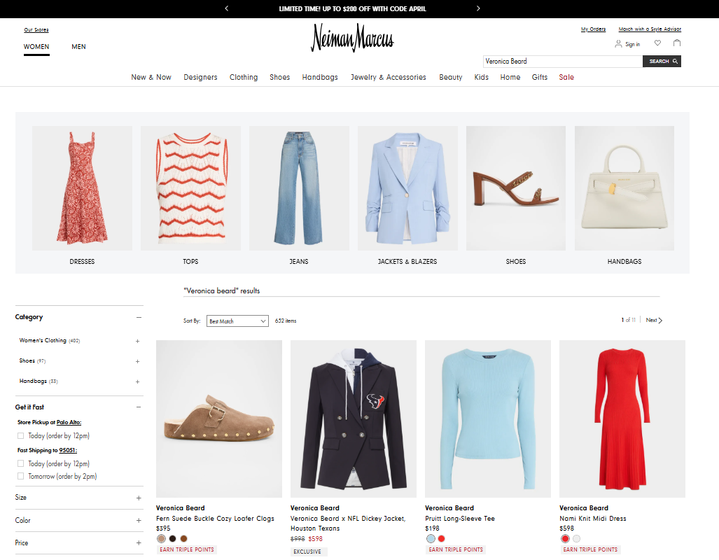 A screenshot of Neiman Marcus’ premium procuring interface exhibiting some Veronica Beard attire.