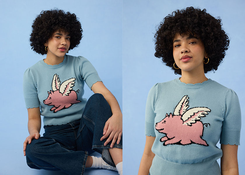 Clare Flying Pig Intarsia Scalloped Brief Sleeve Knit