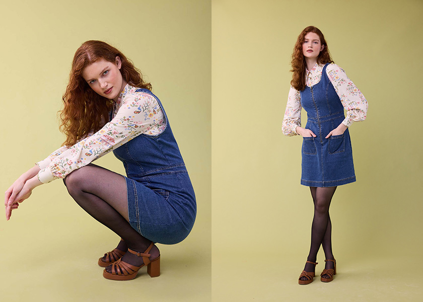 Fiona Cross Sew Tapestry Print Shirt & Mindy Mid Wash Denim Pinafore Gown