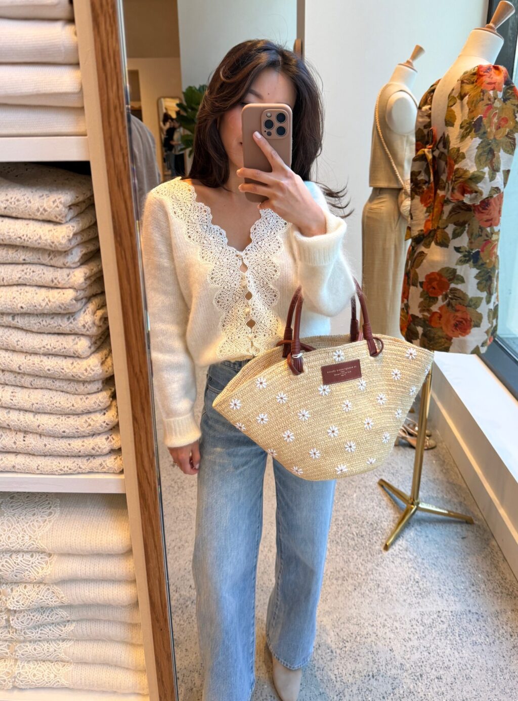 This cardigan has been on my wishlist however I didn’t understand how itchy the knit can be. In particular person it’s a barely fluffy knit, with out an excessive amount of of an itch issue like a few of their Gaspard cardigans. I used to be additionally attempting it on over a nude cami I occurred to be carrying. The lace trim element is beautiful – that is a type of items which might be “outfit makers” everytime you need to be comfortable in a sweater and denims, however nonetheless have a novel and attention-grabbing hero piece. I additionally love the way it seems to be backwards on the mannequin on-line!