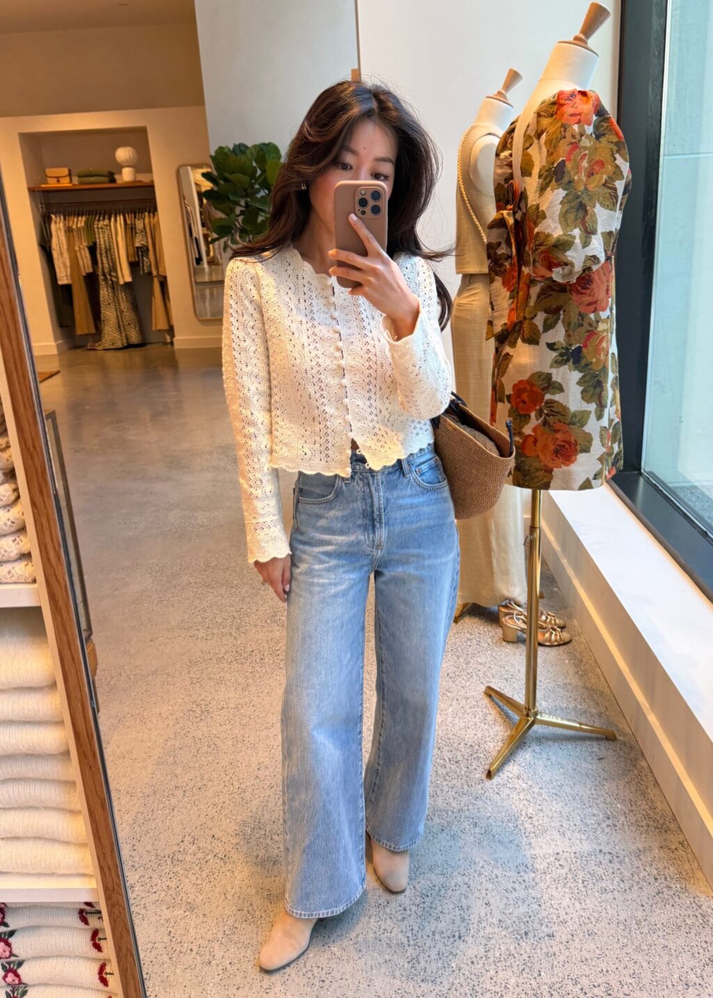 I wore this cardigan to the shop and it’s one of the petite-friendly items from Sézane I’ve ever discovered! As somebody who nearly all the time has to fold or cuff up my sleeves, I used to be thrilled that even the sleeve size labored nicely on me. The general high is a extra slim and shrunken match cropped model, and is a 100% natural cotton lace crochet-like knit. I really like how nicely it pairs with my excessive waisted denims and pants. You may put on a pores and skin toned bra or tank high like this beneath for extra protection.