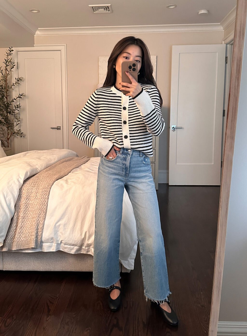 J. Crew denims run a few half measurement large for me however I don’t thoughts a bit of additional room on the waist nowadays. These are similar to Madewell Huge Crop petite in leg form however have just a few key variations: 1) J.Crew has extra shade selections, together with office-friendly choices like a darkish blue 2) J.Crew often does a completed hem as an alternative of a uncooked minimize hem, which is good while you wish to gown the denims up; and three) the J.Crew rise is larger.