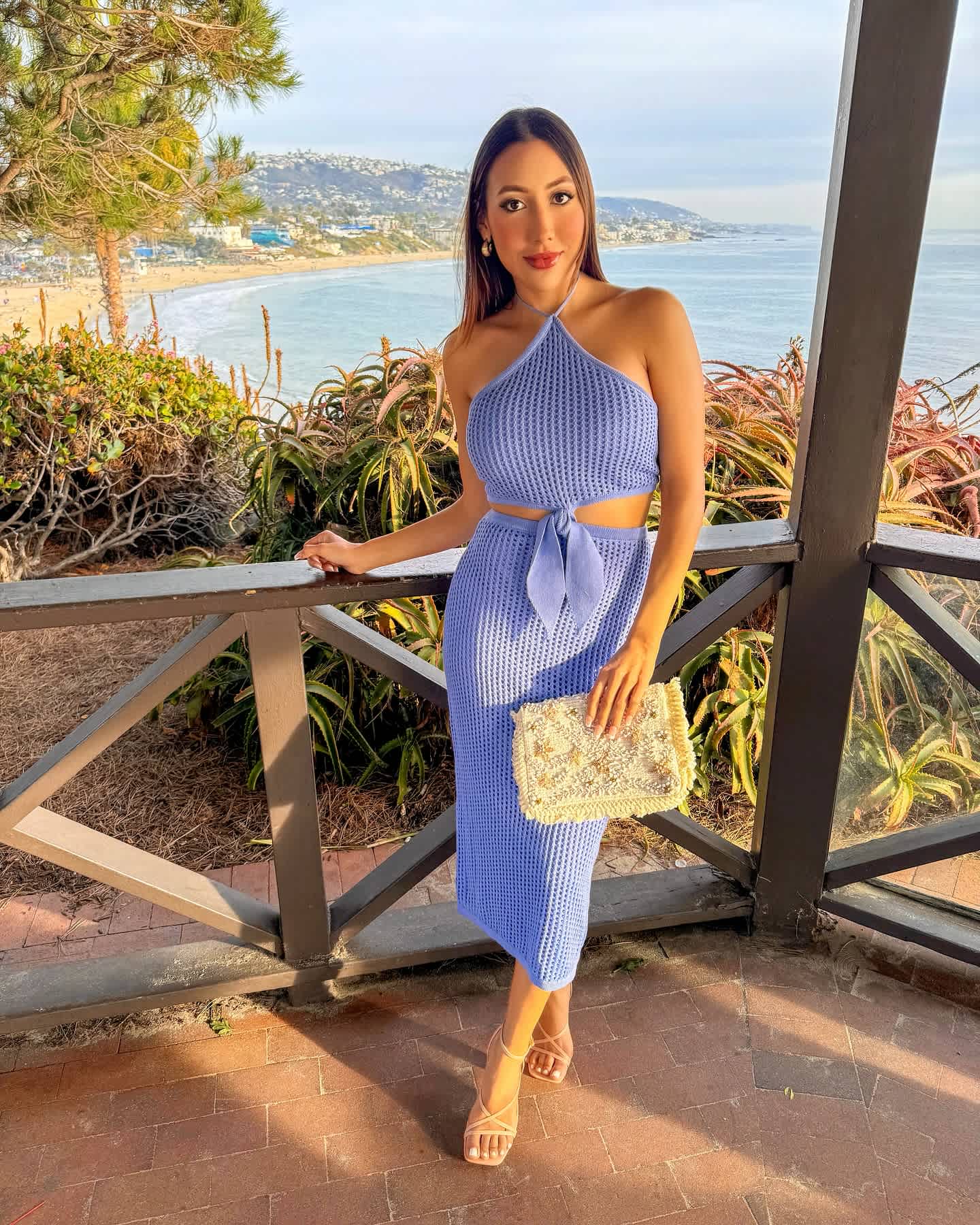 Store the Look: Sunny Serenity Periwinkle Crochet Cutout Halter Midi Gown, Makennaa Mild Nude Strappy Excessive Heel Ankle Strap Sandals Picture through @melissamoniquee
